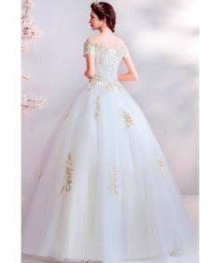半袖にオフショルダー・チュール・レースが豪華なプリンセスAラインロングドレスです♪ファスナーは付いておりませんので背中の編み上げで調整するタイプです。